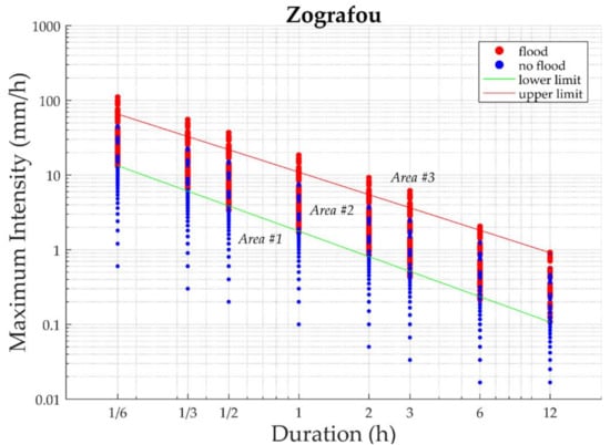 In this stage, another criterion was introduced for the preparation of the final diagrams, which, as expected, led to the reduction of the number of episodes that are examined for durations that are longer than 6 to 12 h. Therefore, the final tables that were created include the date each event starts and the corresponding maximum intensities for the aforementioned durations. Consequently, for each station and with the use of the citizens’ calls threshold, all events are classified as ‘related’ and ‘not related’ to flood occurrence (F–NF, respectively), after comparing each date with the dataset regarding flood incidents within the geographical unit each station covers. Indicatively, Figure 2 presents the maximum rainfall intensity-duration diagram for the Zografou station located relatively close to the city center, in NTUA Campus. The red dots are the F-events that led to flooding, while in blue dots the NF-events. Based on this classification, the diagram can be divided into three areas: Area #1, the red dots overall exceed the blue ones; Area #3, which consists of only blue dots, i.e., the minima; and, the intermediate Area #2 in which blue and red dots coexist. As shown in Figure 2, two curves are defined to delimit these three areas; the green line separated NF-event with mixed conditions, while the red line the mixed area #2 with F-events. These lines that separate these three areas, hereafter called the upper and lower limits in the ID diagrams, and can be described through power-law equations of the form: