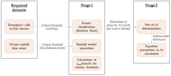 Barbería et al. [11] discussed rainfall intensity thresholds in conjunction with regional vulnerability indicators, including the population density, which is directly linked to the type of urbanization and land use [12]. The results for the 2008–2011 period showed that there is a statistically strong correlation between short-duration rainfall intensities and the requests related to insurance claims, which was the measure of the material damages. Cannon et al. [13] and Guzzetti et al. [14] developed rainfall intensity–duration (ID) thresholds for the occurrence of debris flows, landslides and floods. Particularly, the fundamental analysis of Cannon et al. [13] investigated the relation between debris flow, flood occurrence and various rainfall characteristics (i.e., duration, total depth, intensity) focusing on the central and southern and southwest areas of Colorado and parts of southern California; the study area had undergone extensive forest fires and finally illustrated the differences among storms occurred in the two regions. The importance of this analysis lies on the fact that they compared intensities of two groups of events (related to flood occurrence and not related) and they defined clear ID thresholds that delineate the different statuses.