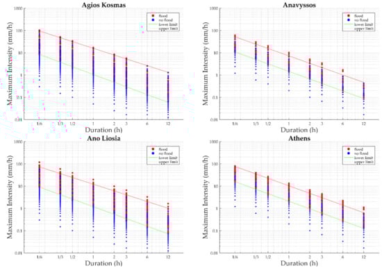 This section includes the results regarding ID thresholds per geographical unit given by the upper and lower limits, as resulted after applying the above-described methodology for each station. Diagrams in Figure 4 show the two groups of events; red dots denote the sets of maximum intensity and duration for an event triggered flooding, while the smaller blue dots correspond to events that are not linked to flood. The limits that separate the three areas (Area #1: no flood, Area #2: mixed conditions, Area #3: flood) are shown in the same figure as green and red lines, switching from no flood-related to mixed conditions, and from mixed to flood-related conditions, respectively.