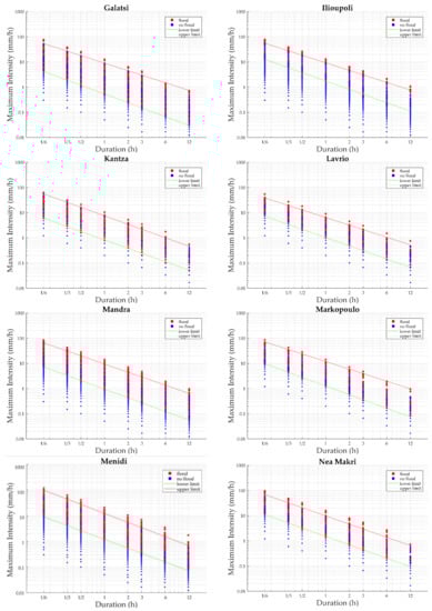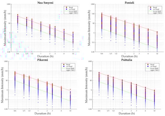 The 17 rain gauges used in the context of this application, were selected to meet the criterion of spatial representativeness. The density of the network, the appropriate spatial distribution of the stations and the longest possible operating period were the main criteria set for station selection. In addition, in order to take into account the specific local characteristics and the vulnerability of each area [11], the administrative boundaries of the municipalities of Attica were correlated with the available rain gauges. The link between the stations and the municipalities’ boundaries follows geographical criteria and is guided by the hydrological scheme, i.e., the surrounding mountains and the hydrographic network. A detailed description regarding this spatial classification is provided by Feloni [23], then applied in [27]. Using the available stations and the criteria set, 17 geographical units were defined; for each of them rainfall records and flood evidence contribute to create the rainfall intensity-duration diagrams of Figure 2. For all rainfall events recorded per station, the maximum rainfall intensities were calculated based on the aggregation method and more specifically on the maximum moving sum for the following durations: 10 min (1/6 h), 20 min (1/3 h), 30 min (1/2 h), 1 h, 2 h, 3 h, 6 h and 12 h. It is obvious that it does not serve any purpose to calculate the maximum intensities for higher durations when the episode’s duration is short, except for those durations that are less than or equal to the episode’s duration. This fact accounts for the different number of points per duration in the diagrams.