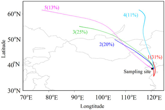 The hybrid single-particle Lagrangian integrated trajectory (HYSPLIT) model is a complete system for computing simple air parcel trajectories, as well as complex transport, dispersion, chemical transformation, and deposition simulations [28], which is available on the National Oceanic and Atmospheric Administration Air Resource Laboratory website (https://www.arl.noaa.gov/hysplit/, accessed on 21 April 2021. The model was widely used to perform a back trajectory analysis to determine the origin of air masses and establish source–receptor relationships [28]. In this study, the model was applied to generate 120 h backward trajectories with 6 h intervals during the sampling period. These air mass trajectories were calculated starting from the sampling site at 10 m above the ground level. A total of 240 trajectories were obtained and these trajectories were bunched in five clusters according to significant variation of total spatial variance of all trajectories [28]. The observed concentrations of PAHs carried by the five clusters of air masses were compared with each other to assess their potential sources.