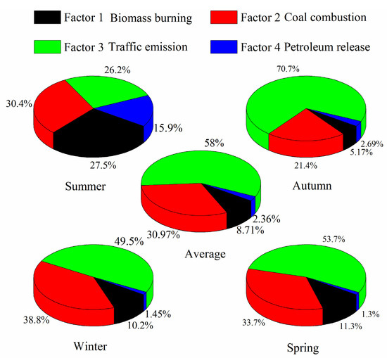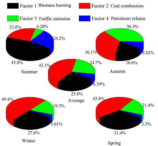 The seasonal contributions of the four source factors identified by the PMF modeling are displayed in Figure 4. The contributions of biomass burning were the highest in summer (45.8%), followed by spring (31.4%), winter (27.6%), and autumn (18.6%). The contribution pattern was similar to that for carbonaceous aerosols and nitrate in PM2.5 on the Bohai Sea because of extensive agricultural waste open burning in fields in the Shandong Peninsula and PAH outflow carried by the East Asian summer monsoon from the emission region [22,23]. The coal combustion contributed 23.8%, 36.1%, 49.4, and 43.8% of PM2.5-bound PAH concentrations in summer, autumn, winter, and spring, respectively. The strongest and weakest contributions were in winter and summer, agreeing extensively with the seasonal source apportionment of atmospheric pollutants over the region [14,22,48]. Traffic emissions accounted for 6.28%, 36.5%, 19.3%, and 21.4% of PM2.5-bound PAH concentrations in summer, autumn, winter, and spring, respectively. Petroleum release contributed 24.2%, 8.82%, 3.61%, and 3.30% of the PAH concentrations in summer, autumn, winter, and spring, respectively. Previous studies reported that petroleum release of river outflow and oil leakage from ships and offshore oil fields (such as Da-Gang and Sheng-Li oil fields) were the important contributors of PAHs in the sediment and air of the Bohai Sea [14,49]. High contribution of the source to PAHs in PM2.5 in the warm season was probably due to volatilization from seawater [14]. The temporal patterns of the source contributions were in agreement with that reported in previous studies [5,14]. As listed in Table 5, the seasonal molecular diagnostic ratios of Ant/(Ant + Phe), Flua/(Flua + Pyr), BaA/(BaA + Chr), and InP/(InP + BghiP) were within defined ranges, indicating that the combustion sources were the main contributors to PM2.5-bound PAH concentrations [16,17].