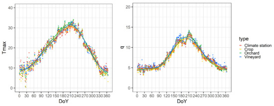 Regional average of maximum air temperature (Tmax (°C)) and specific humidity (q (g kg−1)) in orchards and crop canopies and at climate station Rimski Sancevi (grass) during the 2014–2020 period.