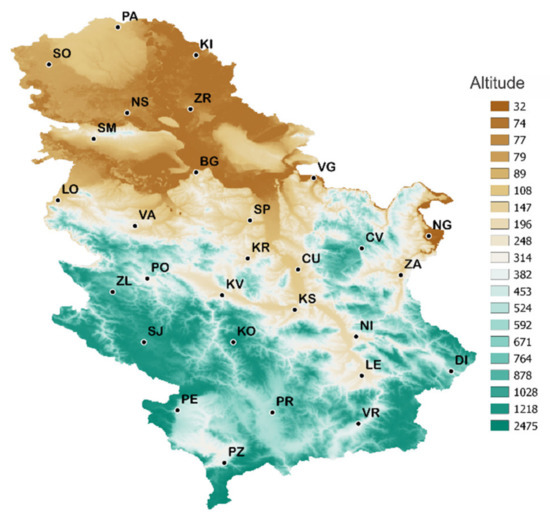 Landscape of Serbia and climate station locations.