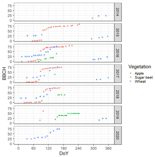 Weekly phenological and plant growth stages for the selected locations were recorded during 2014–2020 according to the BBCH scale (Figure 5) [8]. Since observations are conducted weekly, the recorded phenological stage can correspond with the observation day or to any other day in the previous week. Over the years and at different locations, large differences can be observed at the start date for the growing period. By the end of April, differences among locations and varieties become negligible. To facilitate the use of the existing phenological data for our micrometeorological analysis, we note that BBCH 50–60 corresponds to flowering, BBCH 60–70 corresponds to intensive leaf appearance and development and BBCH 70–80 corresponds to fruit development.