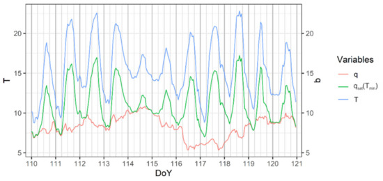 Figure 6. Daily variation of hourly air temperature (T (°C)), specific humidity (q (g kg−1)) and saturated specific humidity (qsat(Tmin) (g kg−1)) in NS/CE orchard for DOY 110–121 in 2014.