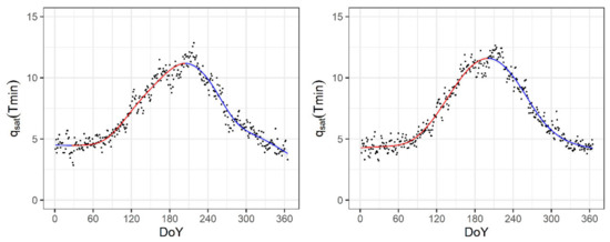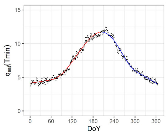 For the period 1990–2020, the daily averages of qsat(Tmin) (g kg−1) for RS climate station (note the denotations used in all the following figures: observed (black dot) and GAM-fitted (red—increasing; blue—decreasing).