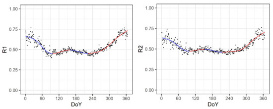 - Relative humidity R2 (R2 = qsat(Tmin)/qsat(Tmax)) is calculated to verify the impact of plant development on the daily ratio of humidity “stored” in nocturnal/early morning RSL occupied by canopy (qsat(Tmin)) and humidity in the well-developed layer associated with Tmax (qsat(Tmax)). According to RS climatology, the first minimum of both R1 and R2 at DOY 92–98 corresponds with the start of an intensive growth in winter wheat (i.e., start of the full growing season in the area (second half of March) (Table 2 and Figure 8)).