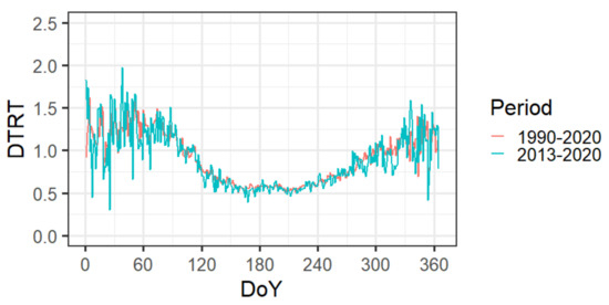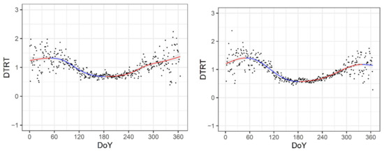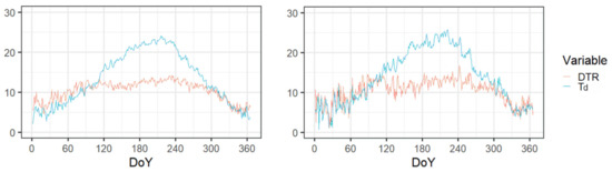 - Daily temperature (Td) and daily temperature range (DTR) seasonal variations have annual patterns that can be attributed to the annual variations of solar radiation, clear sky duration, cloudiness, albedo and snow cover (if appropriate) as major climate factors (see for example [16,17]) as well as plant phenology dynamics. When properly identified and addressed, differences and similarities among Td and DTR patterns allow a better understanding of the processes dominating daily air heating (“responsible” for DTR) and cooling “responsible” for daily temperature changes. The significance of DTR as a climatic index strongly affected by plant phenology is proven in the results of numerous studies [3,18]. At the RS climate station, for example, the start and the end of the growing season of dominant crops (approximately from April to October) can be clearly observed from DTR’s annual trend during the 1990–2020 climatological period (Figure 9, left).