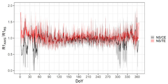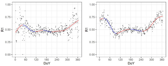 Visual examination shows that the most prominent feature of orchard/crop canopy R1 difference with respect to the RS climate station (denoted as R1 ratio) is its variability over the year (Figure 15). Since the period examined is from DOY 50–60 (“onset of early spring”) to DOY 315 (end of growing season), R1 ratio variability decreases, reaching its minimum during the summer when crop canopy R1 values are typically higher, while orchard values are typically below the station’s values. During the same period, the DTRT ratio is always higher in the field than at the RS station, remaining higher in orchard than in the crop canopy. Since the end of September, i.e., after spring crop harvest, DTRT at the location associated with crop canopy varies around the RS station’s values, while DTRT in orchard retains higher values due to the still-present leaves.