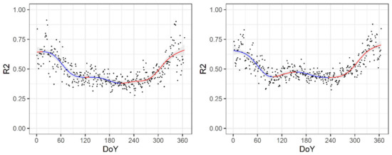 The end of the DTRT “plateau” in orchard (DOY 229) corresponds with the period when orchard trees finish the formation of buds for the next year and fruit formation, “going slowly” to dormancy. In cases of sugar beet (DOY 226), it is the time of intensive yield formation and the start of the process of leaf drying. During this period, plants start to reduce evapotranspiration, shifting radiation balance toward sensible heat flux. Canopy resistance increases in this period and contributes to the second minimum of both R1 and R2 at DOY 242–262. Due to the high variability of both indices, particularly in apple orchard, the timing and magnitudes of R1min and R2min are taken from measured data instead of from the minimum of GAM functions. An increase in daily decrement of temperature that overrides DTR decrease (and leads to an increase in DTRT) can be additionally addressed by the abrupt decrease in sunshine duration from August (285 h) to September (205 h) with the same cloudiness as in July (1981–2010 climatology; Source: RHMS of Serbia).