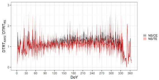 Seasonal variation of DTRT ratio between orchard (black) and crop canopy (red) with respect to RS climate station.