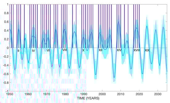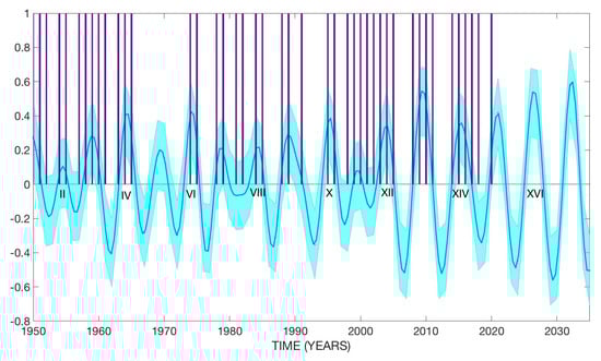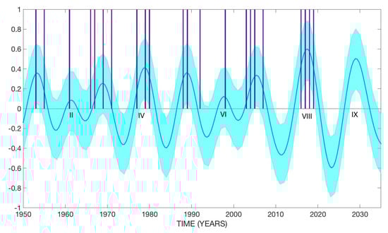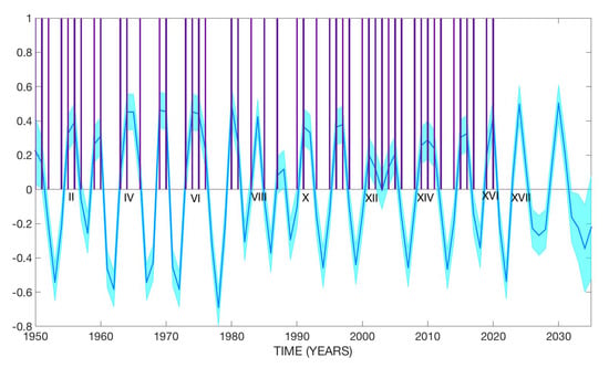 The 5.2-year Bayesian model shows in Figure 4 that historical magnitude 4 hurricanes can be grouped into fifteen groups (clusters 1–XV). All these hurricanes occur in the positive phase of the 5.2-year oscillation, except for cluster V, where category 4 Atlantic hurricanes were not reported. Cluster XV ends in 2022 ± 1, so it is possible that between 2022 and 2023 there could be at least one category 4 hurricane. The next category 4 hurricane season (cluster XVI) will begin in 2025 ± 1 and end in 2028 ± 1. In addition, between one and at least four category 4 hurricanes would be expected to occur in cluster XVI.