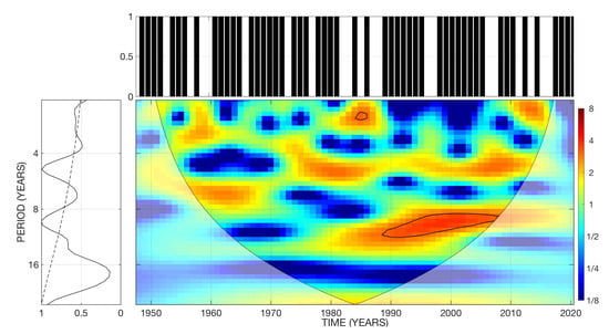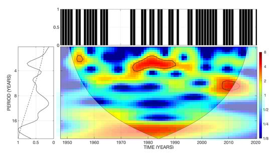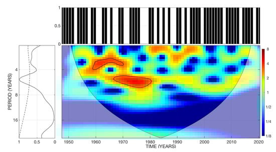 Time-frequency wavelet results of category 5 Atlantic hurricanes between 1950 and 2021. The digital time series for category 5 Atlantic hurricanes is shown in the upper panel. The global wavelet spectrum is shown in the left panel. The central panel shows the calculated wavelet Power Spectral Density (PSD) in normalized units adopting the red-green-blue color scales. The Cone Of Influence (COI, “U”-shaped curve with shaded outer zones) shows the possible edge effects in the PSD. The time-frequency regions with wavelet spectral power detection above 95% confidence level are marked with thin black contours.