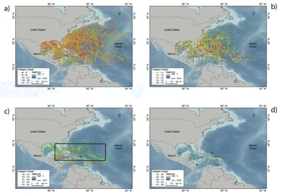 It can be seen that the speeds of category 2 and 3 hurricanes are rather uniformly distributed or evenly populated throughout the Gulf of Mexico and the Atlantic Ocean. In comparison, the speeds of category 4 hurricanes are preferably reached outside the Gulf of Mexico (this area is shown inside a rectangle in Figure 9c) except for the southeastern United States.