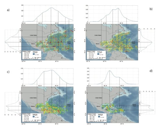 Probability distribution maps for the Atlantic hurricane wind speed for: (a) Category 2; (b) Category 3; (c) Category 4; (d) Category 5. The vertical and horizontal lines indicate the local maxima for the longitudinal and latitudinal distributions, respectively. The main point of this spatial clustering map is to indicate the possible connection between the climatic and geographical conditions for the development of maximum speed of Atlantic hurricanes.