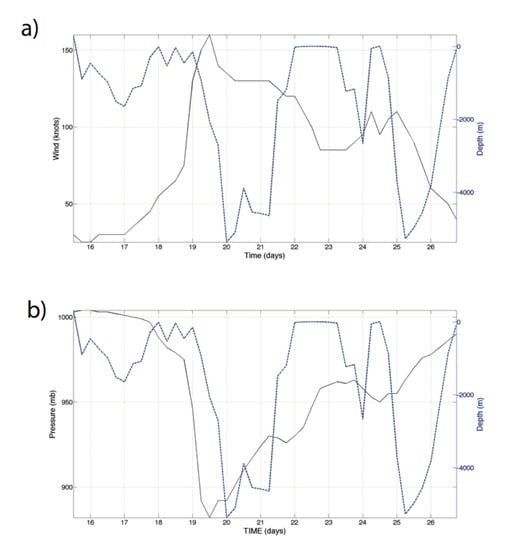 Category-5 Hurricane Wilma (2006). (a) This is an example of the analysis of the category-5 hurricane Wilma wind speed and bathymetry. It reaches its maximum speed (black line) around the greatest depth (−4500 m; dotted blue line). (b) It is also possible to analyze the atmospheric pressure data for the same example of Wilma. It reaches its minimum pressure (black line) around the greatest depth (−4500 m; dotted blue line).