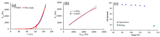 - National Institute of Standards and Technology (2021) Benzoic acid. Available online: https://webbook.nist.gov/cgi/cbook.cgi?ID=C65850&Mask=4&Type=ANTOINE&Plot=on (accessed on 3 April 2021).
