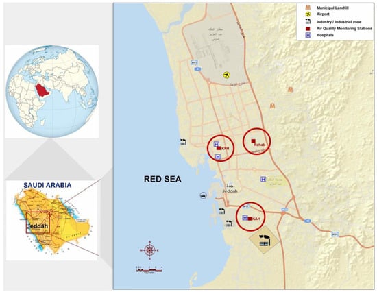 Jeddah city (Figure 1) is the second-largest city in Saudi Arabia, located in the Hijaz Tihamah region (Lat. 21.3° North and Lon. 39.2° East), midway eastern shore of the Red Sea. The city has a municipality area of 5460 km2 and population of 3.98 million people [23]. Jeddah features a semi-arid to arid climate [24]. Rainfall only occurs around November to January, with an annual mean of 44.6 mm (http://www.holiday-weather.com/jeddah/averages/ accessed on 4 May 2021). The city is characterized by heavily industrialized areas with different types of industries (such as oil refineries, desalination, iron smelting, etc.), heavy vehicular traffic, and sandstorms.