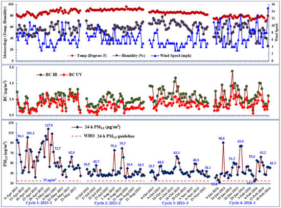 Black carbon (BC) had a significant daily variability but with no major seasonal variability observed (Figure 2). This was linked to BC being mostly associated with vehicular and industrial emissions. Emissions from these sources may fluctuate significantly by the day of the week (weekday–weekend trends), but not by season. BC, as represented by a signal at infra-red λ (BCIR), explained only 3.6–7.2% of the total PM2.5. In addition, the mean delta–C levels per cycle were below zero (Table 1). Only two (2) days in cycle 1 had delta–C ˃ 0 (0.01 and 0.14 μg/m3). Delta–C, computed as the difference in BC measurements at ultraviolet λ (BCUV) and BCIR, is a strong marker for organic matter combustion [26,27]. Thus, the observed results in this study point to a minor or no contribution from biomass burning to the overall recorded PM2.5 levels in Jeddah.
