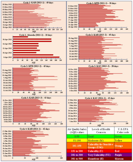 The AQI was calculated [51] based on the observed daily PM2.5 levels (Figure 3). The calculated AQI for any given pollutant is always proportional to its levels in the air. Thus, the high AQI values, as seen in this study, simply imply elevated levels of ambient PM2.5 in Jeddah. This also translates to a great deal of severe health risk for the exposed population. With exception of cycle 1 that recorded unhealthy to very unhealthy AQI, the general air quality for the rest of the study period was mostly at a moderate level (Figure 3). Notably, we did not observe a single day with good air quality throughout the study period. This further stressed the severity of particulate air pollution in Jeddah and the rest of the Middle East region. Moreover, the AQI in this study was calculated using only the overall PM2.5 levels. Thus, we may have potentially underestimated the severity of the observed air pollution levels. Results could possibly show more severe health effects, if additional AQI values based on the gaseous pollutants, such as ozone (O3) and sulfur dioxide (SO2), were available. It is also noteworthy that, though the AQI provides a simplified interpretation of the health hazard level associated with an exposure to a given air pollutant, it is not an air quality guideline. Nevertheless, the AQI results can inform the process of policy formulation and implementation.