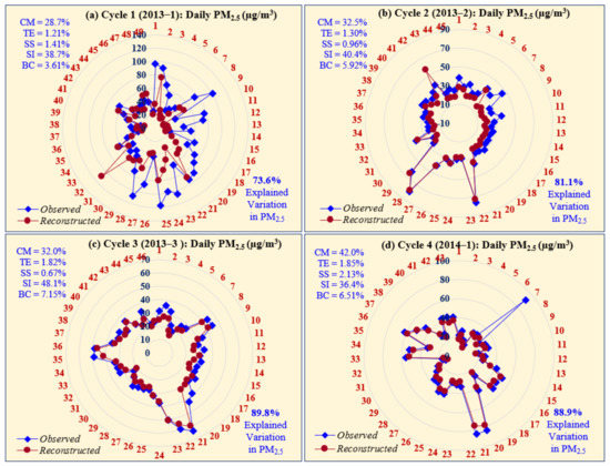 The estimates of particulate organic matter (POM) were not available for this study. In addition, converting the total S from ED-XRF to SO42− (expected) and comparing it with the soluble SO42− from IC analysis (observed), showed significant differences per cycle (Table S3). While cycle 1 over-estimated SO42−, cycles 2–4 showed significant under-estimates of observed SO42−. This may partially be due to some S-containing compounds not being completely water-soluble [36]. The observed SO42− represents only the water-soluble portion. The PM mass closure on SI used the observed SO42−. The remaining water-insoluble portion and POM account for the unexplained portion of PM2.5 during cycles 2–4. Despite the significant over-estimates in SO42−, cycle 1 still had the largest portion of unexplained PM2.5 (26.4%). This may partially be attributed to the missing POM and some measurement errors. Besides being a useful tool for delineation of sources, PM mass-reconstruction can be utilized for assessing the data integrity where significant over- and under-estimates may be revealed by comparing the observed and re-constructed levels of target pollutants, as shown in Figure 4.