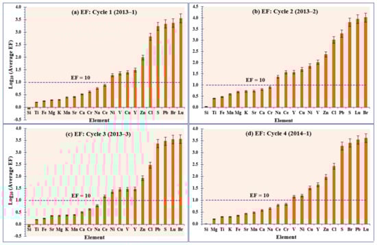 The log transformed enrichment factors (EFs) of trace elements measured from PM2.5 per cycle—averaged sampling sites: cycle 1—(a), cycle 2—(b), cycle 3—(c), cycle 4—(d). Elements with EF values exceeding 10 (as indicated by the dotted line), have significant proportions coming from anthropogenic emission sources.