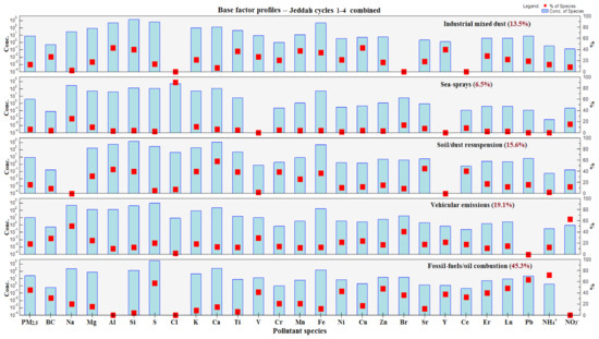 Overall, the five delineated PM2.5 sources in Jeddah were: (1) fossil-fuels/oil combustion (45.3%)—S, V, Pb, Ni, Lu, Zn, Br, Y, and BC; (2) vehicular emissions (19.1%)—NO3−, Br, Cu, Zn, Ni, V, S, Mg, Na, and BC; (3) soil/dust resuspension (15.6%)—Mg, Al, Si, K, Ca, Ti, Cr, Mn, Fe, Zn, Sr, Er and Pb; (4) industrial mixed dust (13.5%)—Mg, Al, Si, S, K, Ti, V, Cr, Mn, Fe, Ni, Cu, Zn, Sr, Y, Er, Lu, Pb and BC. Jeddah has several industries and heavy vehicular traffic. The industrial dust contained a mixture of pollutants emitted from several anthropogenic activities; and (5) sea-spray (6.5%)—Cl, Na, Mg, K, and Ca. Jeddah’s location at the coast of the Red Sea, makes the contribution from sea-sprays to the overall air pollution significant.