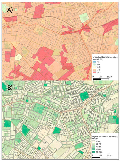 Urban heat island temperature anomaly (A) and % vegetation cover (B).
