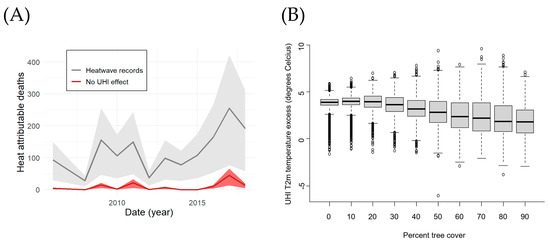 The association between heatwaves and mortality is well described and is of increasing concern as climate warming progresses [22]. The present data show that the future health burden of heatwaves could be effectively diminished by interventions that limit excess heat in urban environments. Among possible interventions, increased tree cover could reduce the impact of low albedo surfaces, which contribute substantially to excess urban heat [20]. The data in Figure 3B indicate that median UHI temperature excesses are approximately halved in areas with very high tree cover, warranting additional close consideration of other sources of urban heat.