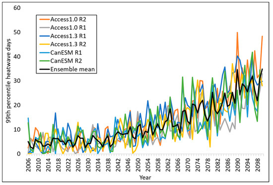 Future annual numbers of heatwave days exceeding the 99th percentile 24 h temperature threshold for at least two consecutive days from the period 1986–2005; heatwave days were flagged for the global climate model (GCM) ensembles CSIRO-BOM ACCESS1.0, CSIRO-BOM ACCESS1.3 and CanESM2 based on the physical configurations of the weather research and forecasting (WRF) models R1 and R2. The ensemble mean is shown as a black line.