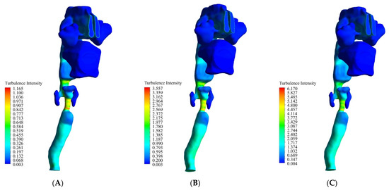 - The maximum turbulence intensity occurred in the larynx. At 13 L/min, 55 L/min, and 100 L/min, the maximum turbulence intensity was 1.1, 3.5, and 6.1, respectively;