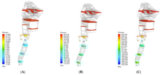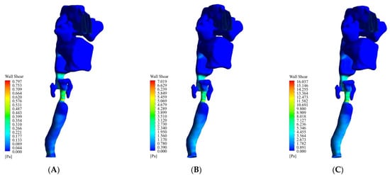- The maximum WSS occurred in the larynx. At 13 L/min, 55 L/min, and 100 L/min, the maximum WSS was 0.62 Pa, 5.4 Pa, and 12.4 Pa, respectively.