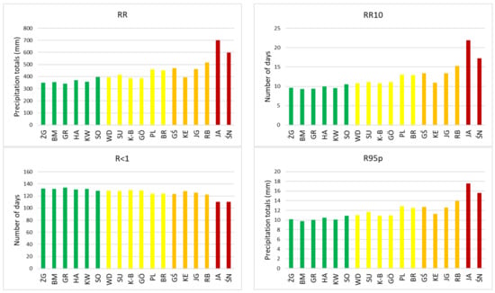 Values of the selected precipitation indices in the warm half-year of 1971–2018 at the stations representing lowlands (green), uplands (yellow), mountain foreland (orange) and mountains (red) of the PSBR.
