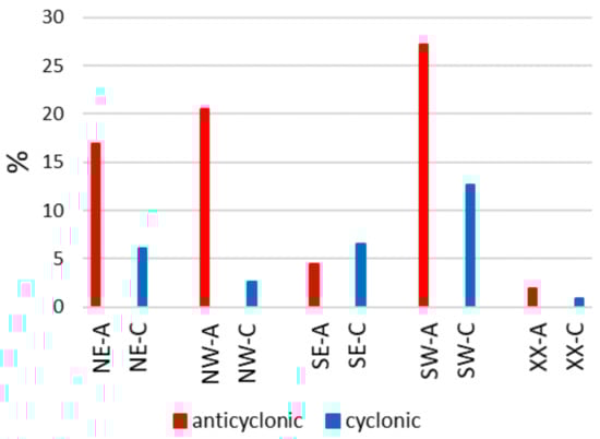 In terms of circulation conditions, according to the calendar of the circulation types [], the anticyclonic weather occurred on more than 70% of days in the warm half-year period. About 50 days (27%) in the April–September period were related to the SW-A type, while the circulation of NW-A and NE-A occurred on 38 and 31 days (17–21%) respectively. Regarding the cyclonic circulation, SW-C was the most frequent type (23 days), while the days with SE-C and NE-C occurred twice as low (11–12 days). The remaining types of circulation were characterized by a lower frequency (Figure 3).