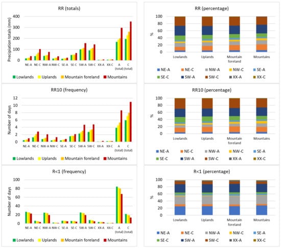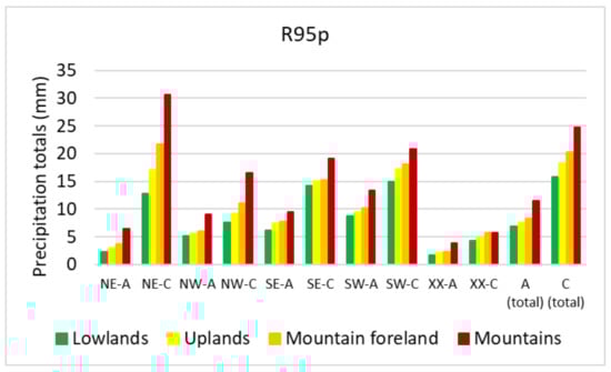 Comparing the selected hypsometric zones, the absolute number of R < 1 for each circulation type was higher at the stations located lower down and rose with the increasing altitude. A different situation was observed for the previously discussed indices of RR and RR10. In this case, the highest values for particular types of circulation were noticed in the mountains (Figure 4). The increase with the altitude was also reported for R95p. In the mountains and mountain foreland, the highest amounts were noticed for NE-C (Figure 5). This shows that the mountainous regions during NE-C circulation are vulnerable to the impact of strong precipitations. It should be emphasized that the magnitude of such precipitations can be intensified by the orographic effect. Such conditions are also connected with the direction of the main ridge of the Sudetes Mountains (stretched NW to SE), which is a favoring factor in the context of air masses advections from NE.