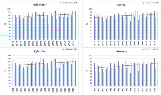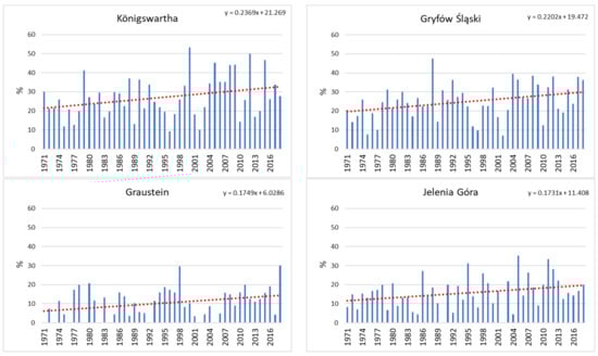 Changes in the percentage of R < 1 frequency under NW-A circulation at the stations representing the lowlands (Halbendorf), uplands (Görlitz), mountain foreland (Rębiszów) and mountains (Jakuszyce) in 1971–2018.