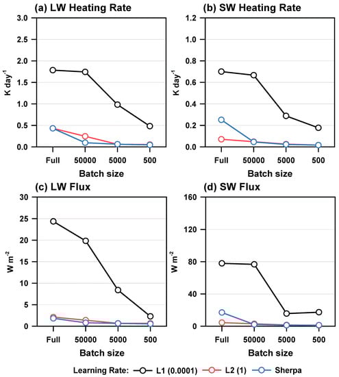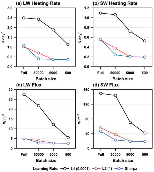 Figure 1 show the RMSE of LW/SW heating rates and LW/SW fluxes between the control simulations (L1 and L2) and Sherpa experiments for the offline evaluation (i.e., for independent validation sets). Here, the land and ocean results are combined, and all sky conditions, including clear and cloud conditions, are considered. In the Sherpa experiment, the optimal learning rates were determined to be 0.6199, 0.6032, 0.6656, and 0.4756 for batch sizes of full, 50,000, 5000, and 500, respectively. These results are thought to be related to the argument that batch size and learning rate should be proportionally used to obtain a consistent result []. The Sherpa also exhibited the lowest optimal learning rate (0.4756) for the smallest batch size. The optimal learning rates by Sherpa were closer to L2 (1) than L1 (0.0001). We suspect the possibility of affecting a large number of training sets on these systematic optimal learning rates to L2. However, before conducting experiments on learning rates, we could not recognize the optimal learning rate because it is highly sensitive to the characteristics of the training sets. Therefore, Sherpa can help determine an optimal learning rate without extensive sensitivity experiments. In Figure 1, it is evident that the RMSEs tend to decrease for small batch sizes. The use of an appropriate small batch size is generally known to provide better accuracy than the full batch size []. Nevertheless, the use of small batch size is not popular compared to the full batch for attempting because of the increase in computation time owing to less parallelization. The L1 experiments show a dramatic error decrease with decreasing batch size, whereas the L2 experiment represents a gradual error decrease. Thus, the difference between L1 and L2 decreased as the batch size decreased. This is because the error in the L1 experiment is too large when the batch sizes are large. For the L2 experiments, there was no significant difference in batch sizes of 5000–500, suggesting that there is an optimal range of batch sizes for a given problem. The Sherpa experiments showed evidently smaller RMSEs than L1 for all variables. This confirms the usefulness of Sherpa in automatically optimizing the learning rate. However, for the full batch, the difference between L2 and Sherpa was not large. The RMSEs for the LW/SW heating rate and LW flux were slightly larger in the Sherpa experiment than in L2. Because the optimization of Sherpa was performed on the training set, robust generalization may not be sufficient for independent validation sets (this issue also continues in the online testing). The difference between L2 and Sherpa was the largest at a batch size of 50,000, and this difference was almost diminished for batch sizes of 5000–500. Thus, it can be understood because the optimal learning rates inferred by Sherpa are close to the L2. In conclusion, Sherpa contributed to the RMSE improvements of 131–507%, 97–339%, 111–701%, and 123–539% for LW heating rate, SW heating rate, LW flux, and SW flux, respectively, compared with the L1 experiment. When compared to the L2 experiment, the maximum RMSE improvements by Sherpa were 74%, 57%, 42%, and 66% for the four variables at a batch size of 50,000, while significant further improvements were not found for different batch sizes, except for SW flux at the full batch size (20%).