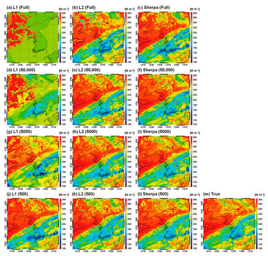 Figure 3 show the spatial distributions of outgoing LW radiation (OLR) simulated from radiation emulators trained with different batch sizes (full to 500) and learning rates (L1, L2, and Sherpa) for an extreme precipitation case associated with the Changma front (2020-07-28/03UTC). This case was long-term integrated with 156 h forecasts initialized from 2020-07-21/15UTC. Because a 20 s time step and 65,988 spatial grids were used, the radiation emulator was repeatedly used in the WRF model 1,852,943,040 times (28,080 × 65,988). Physically, OLR is highly sensitive to the presence of clouds. If there is a cloud, the OLR tends to decrease because a colder temperature, compared with the surface, is emitted from the cloud top. Thus, in Figure 3, red colors indicate clear areas, whereas green, blue, and purple represent clouds. In particular, purple areas with the lowest OLR indicate deep convective clouds. When the full batch size and lowest learning rate were used (Figure 3a), the simulated OLR pattern was far from the true value based on the original radiation parameterization (Figure 3m). The OLRs in Figure 3a are mostly distributed around 200 and 300 W m−2. This simulation is a typical blow-up case induced by the use of an incorrect radiation emulator. Belochitski and Krasnopolsky (2021) [] also produced unphysical OLRs when the developed radiation emulator had a large representation error when online testing was significantly different from training sets. For a batch size of 50,000 and the lowest learning rate (Figure 3d), the blow-up issue appeared to be somewhat mitigated but not completely solved. For example, deep convective clouds with an OLR of approximately 100 W m−2 were not expressed at all in Figure 3d. When the batch sizes were further decreased to 5000–500 (Figure 3g,j), the OLR simulations also tended to be close to the true value. When the highest learning rate was used, the simulated OLRs for all batch sizes showed a reliable pattern with the true value, whereas further improvements were found with the use of small batch sizes (Figure 3b,e,h,k). The Sherpa experiments also showed similar OLR patterns to the true values (Figure 3c,f,i,l). When the batch sizes were large, Sherpa was thought to be more useful compared with the two control simulations.