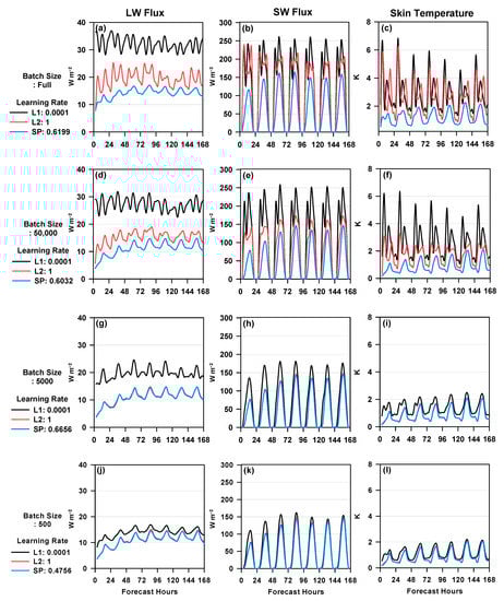 For a more quantitative analysis, the time series of the RMSE for the LW flux, SW flux, and skin temperature was further examined (Figure 4). Note that the flux results are the average of the three fluxes at the top and bottom of the atmosphere. In Figure 4, 168 forecast time results were given at a 3 h resolution. Each point in the time series indicates the statistics for the four weekly cases with different initializations and for the entire domain (234 × 282 grids). When the full batch size was used, the RMSEs of the simulated LW/SW fluxes and skin temperature fluctuated within the range of larger values. Compared to the lowest learning rate, the results of the highest learning rate and Sherpa showed lower RMSEs for the three variables (Figure 4a–c). A similar trend was also observed for the case using a batch size of 50,000 (Figure 4d–f). When the batch size decreased, the differences among the emulator results also tended to decrease (Figure 4g–l). In both full and 50,000 batch sizes, the Sherpa results were evidently better than the highest learning rate results. In contrast, the two emulators did not show much difference for batch sizes of 5000 and 500, although they were still better than the lowest learning rate. The resulting RMSEs for LW/SW fluxes and skin temperature tended to gradually increase with forecast time while showing a diurnal fluctuation between day and night. The increase in isolation and surface heating during the daytime are thought to affect the diurnal fluctuation.