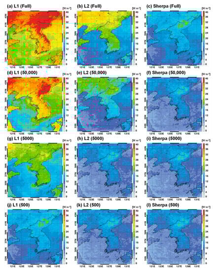 Spatial distributions of the root mean square errors (RMSEs) for LW flux simulated from radiation emulators based on different batch sizes ((a–c): Full, (d–f): 50,000, (g–i): 5000, (j–l): 500) and learning rates (L1, L2, and Sherpa). Four weekly cases and 7-day forecast period were used to calculate the RMSE at each location.