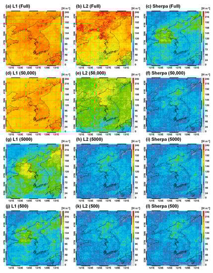 Spatial distributions of the root mean square errors (RMSEs) for SW flux simulated from radiation emulators based on different batch sizes ((a–c): Full, (d–f): 50,000, (g–i): 5000, (j–l): 500) and learning rates (L1, L2, and Sherpa).