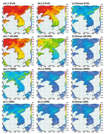 Spatial distributions of the root mean square errors (RMSEs) for skin temperature simulated from radiation emulators based on different batch sizes ((a–c): Full, (d–f): 50,000, (g–i): 5000, (j–l): 500) and learning rates (L1, L2, and Sherpa).