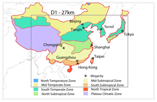 The WRF-CMAQ-based PATH modelling system was adopted to study the effects of LRT, STT, and PRB ozone over EA. The PATH system is the model used by Hong Kong Environmental Protection Department (HKEPA) for studying Pollutants in the atmosphere and their Transport over Hong Kong. The system has been validated intensively via in-house and contracted studies [23]. The PATH platform comprises four nested domains from 27 km Asia and Southeast Asia (D1) down to 1 km Hong Kong (D4). For this study, only D1, which covers multiple countries, including China, Japan, North Korea, South Korea, Myanmar, Laos, Northern Thailand, and Vietnam, was applied, as shown in Figure 1. A detailed description of the PATH system is discussed in Section 2.3. The target periods of this study are January, April, July, and October of 2006. To achieve the study objectives, multiple GEOS-Chem boundary cases with different emission removals were implemented to generate CMAQ boundary conditions. For evaluating seasonal and geospatial variations of PRB ozone, climatic zones (as shown in Figure 1) were adopted to represent the ozone changes over EA. Moreover, multiple megacities/cities were selected for comparative ozone assessment, including Hong Kong, Guangzhou, Shanghai, Beijing, Chongqing, Tianjin, Seoul, Tokyo, and Taipei. Details of each component are summarized below.