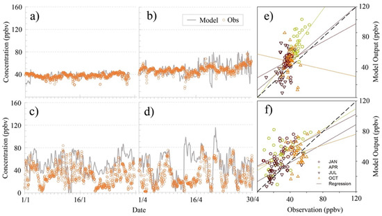 Hourly time series of observation comparison: (a) January at Ryori, (b) April at Ryori, (c) January at Tap Mun, and (d) April at Tap Mun. Daily mean scatter plots for model vs observation: (e) Ryori and (f) Tap Mun.