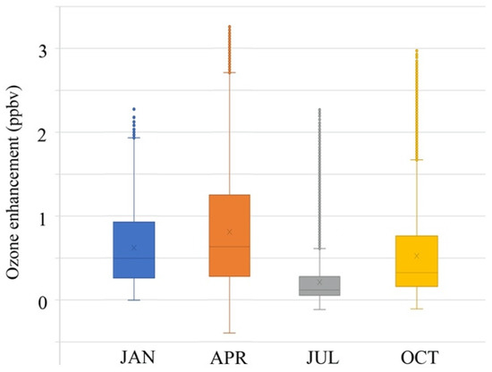 In January, the mean ozone enhancement was 0.62 ppbv, with of IQR of 0.66 ppbv. In April, both the mean value (0.81 ppbv) and IQR (0.97 ppbv) increased. The range of ozone enhancement was also much more significant than that in January. A clear difference in ozone enhancement, however, is found in July. The mean value dropped to 0.21 ppbv, and the IQR shortened to 0.22 ppbv. The box also occupies a lower position than those two months. Although the IQR for July was very small, many data points belonged to outliers. The ozone enhancement rose again from July to October, in terms of mean (0.53 ppbv) and IQR (0.60 ppbv). Overall, the average LRT impact from NA over the four months was about 0.54 ppbv, comparable with the 0.23 ppbv reported by Fu et al. [16]. The maximum LRT impacts, indicated by the most extreme values from NA, were 2.27 ppbv, 3.25 ppbv, 2.28 ppbv, and 2.99 ppbv for January, April, July, and October, respectively. These values were mainly found at the elevated mountainous grids (i.e., Himalayas), which were at the level of the free troposphere. In terms of seasonal ozone impact, it is clear that April has received more impact than the other months, while July was the least affected.