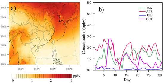 Other locations with considerable STT enhancement were the north and northeast parts of East Asia near Japan and Korea. The ozone enhancement from STT may be attributed to the unstable meteorological condition from the transition between winter and summer monsoons, which intensified the vertical transport of air parcels between the upper and lower atmosphere, driving high ozone aloft from the northbound to the affected areas [36,37,38]. Figure 5b shows the seasonal ozone impacts from STT in the affected area (i.e., Tokyo). Among them, April had the highest ozone enhancement, followed by October, January, and July. Other cities in the north (e.g., Beijing and Seoul) also show similar seasonal patterns (Figure S3b). For the cities in the south, enhancement from STT was a lot weaker than in the cities in the north. As tropopause height is somewhat positively correlated with the ambient temperature, lower STT enhancement is generally expected from the cities with warmer weather (See Figure S3 for two other selected cities). For example, the effect of STT in Guangzhou (i.e., mean value of 0.6 ppbv) was much smaller than in Beijing (i.e., mean value of 2.1 ppbv) for April. The simulated maximum daily enhancement for January, April, July, and October from STT for the entire domain were 3.6 ppbv, 7.5 ppbv, 4.0 ppbv, and 5.6 ppbv, respectively.