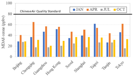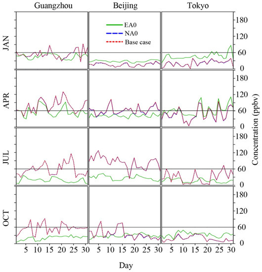 In January, Beijing and Tokyo had a higher daily average ozone in EA0 than the base case. It indicates that heavy NOx titration with limited photochemical reactions was involved. Among these cities, Tokyo had experienced the strongest NOx titration (as indicated by the difference between the base case and EA0) due to the regional transport of air pollutants from China and Korea. As the temperature in January over the northern part of East Asia was very low, it didn’t encourage photochemistry. So, ozone was relatively low in those two cities. However, in Guangzhou, some ozone production has been detected, and the ozone values in the base case were higher than in EA0. In April, photochemistry started to take place in Beijing. A slight increase in ozone is found in the base case, while Tokyo was still under the same influence from NOx titration with limited photochemistry. The ozone concentration in the base case was still higher than in EA0 for Guangzhou, which was similar to that in January, but with larger magnitudes. In summer (July), all three cities exhibited a positive increase in ozone from EA0 to the base case, attributed to a much lower ozone background in July. In July, the background ozone (EA0) for those cities was consistently low than the regulatory value of 60 ppbv (hourly standard) from the Japanese environmental quality, indicating that reducing anthropogenic emissions could comply with Japan’s ozone regulations. In contrast, the daily background ozone values in April occasionally exceeded the value of 60 ppbv in Tokyo, reflecting that emission reduction may not be sufficient to resolve the high ozone background. In October, the cold weather emerged again, resulting in a similar situation as in January. The ozone concentration in Guangzhou for the base case was always higher than that of EA0. In Beijing, higher ozone concentration is detected in the base case for most days in the first half of October, but it reversed in the second half. For Tokyo, the relationship between the base case and EA0 was similar to that in January, but there was less difference in ozone values between them. The summary of EA0 for the monthly maximum MDA8 ozone from the nine selected cities is shown in Figure 7.