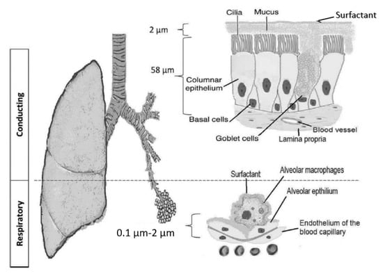 The pulmonary route is composed of two structural parts that have different physiological characteristics (Figure 1): the (upper) conducting airways and the respiratory airways [1,2,3,4]. The conducting airways extend from the trachea to the terminal bronchioles, a series of approximately 16 generations [5]. This is followed by the respiratory bronchioles, starting at approximately 17 generations and ending at the alveolar sacs. The conducting part has pseudo-stratified columnar ciliated epithelia with mucous-secreting cells, which are responsible for the mucociliary clearance of the airstream of any exogenous particles, dust, and bacteria (Figure 1). The thickness of the epithelium is approximately 60 μm, with a thick mucus layer overlying a watery periciliary layer that contains the airway cilia [6]. The surfactant is secreted in the airways by club cells [7]. The surface area of the epithelium cells is about 2 m2 [8]. Its main functions are to transport the air to the gas exchange area and to humidify, adjust the gas temperature, and filter the incoming air stream [9]. The respiratory airways are proximal to the terminal bronchioles and end in the alveolar sacs. In the alveoli, there is a very thin (0.2–2 μm) epithelium of alveolar cell type I (main cells) and type II cells, which secrete the pulmonary surfactant [10]. This large surface area (100–140 m2) is responsible for gas exchanges and demonstrates a high permeability toward water and macromolecules, making it a suitable target for drug delivery [11,12].
