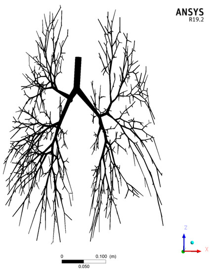 - Horsfield, K.; Dart, G.; Olson, D.E.; Filley, G.F.; Cumming, G. Models of the Human Bronchial Tree. J. Appl. Physiol. 1971, 31, 207–217. [Google Scholar] [CrossRef]